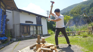 実際にヒノキ風呂などに用いている薪を自ら割ってみる。お風呂の暖かさが一段と身体に染みる。
